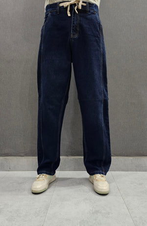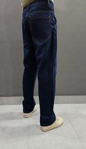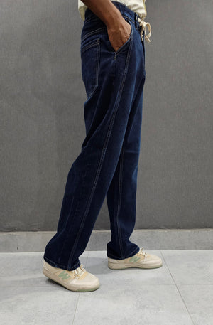 Dark Blue Front Double Stitch Loose Fit Jeans, soft comfortable non stretch Denim.