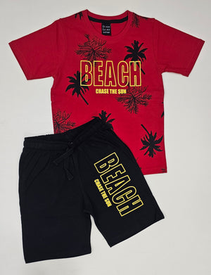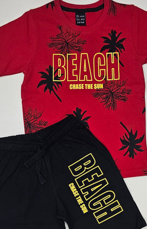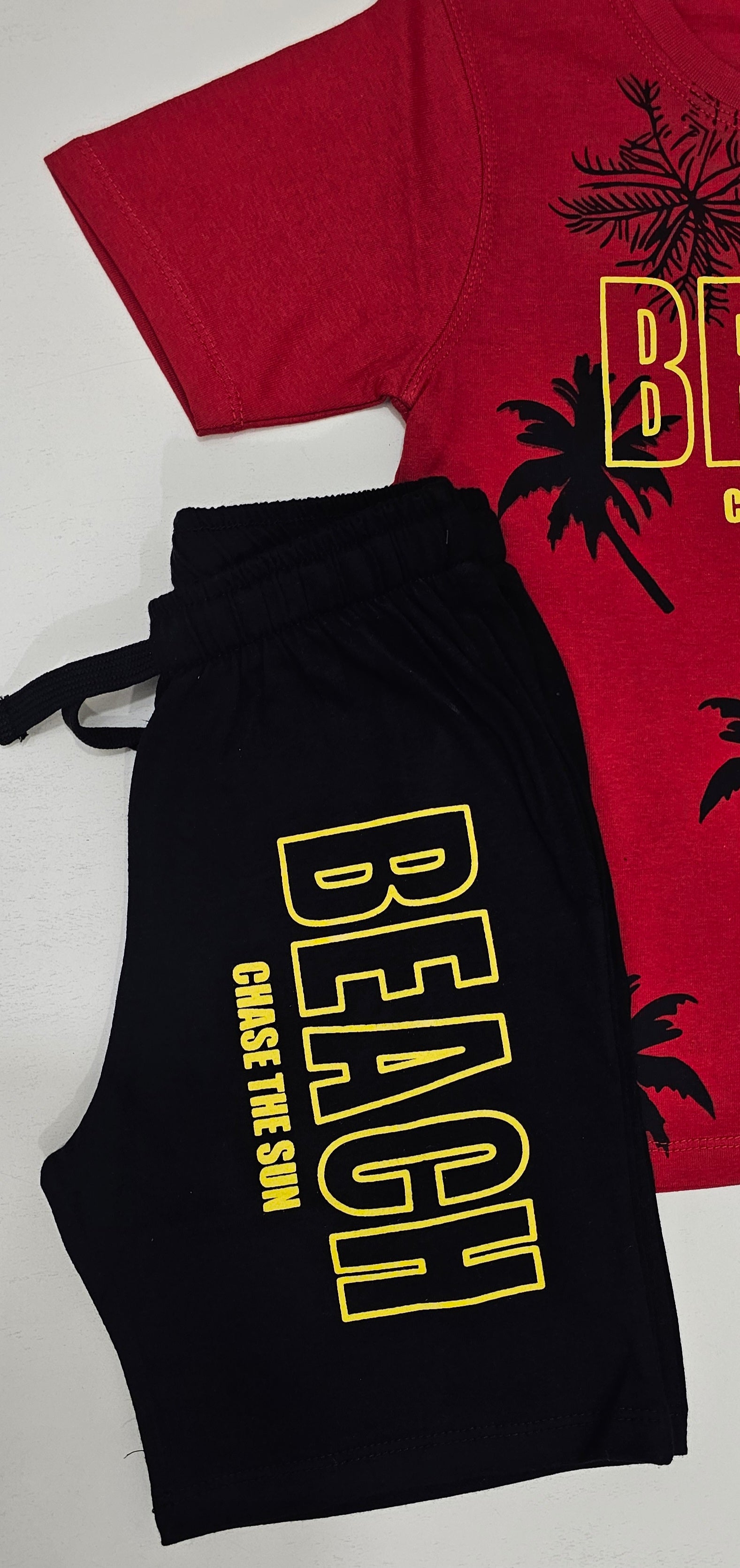 Red Beach floral print Tshirt with blackshorts in Cotton jersey fabric.