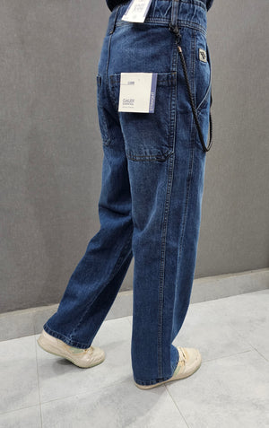 GD- Mid Blue. Loose Fit Jeans, side stitch panel with chain, soft comfortable non stretch Denim.