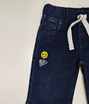 Soft Denim Stretch Fabric, perfect for summer with embroidered smiley design. Adjustable elastic is attached inside waist belt.