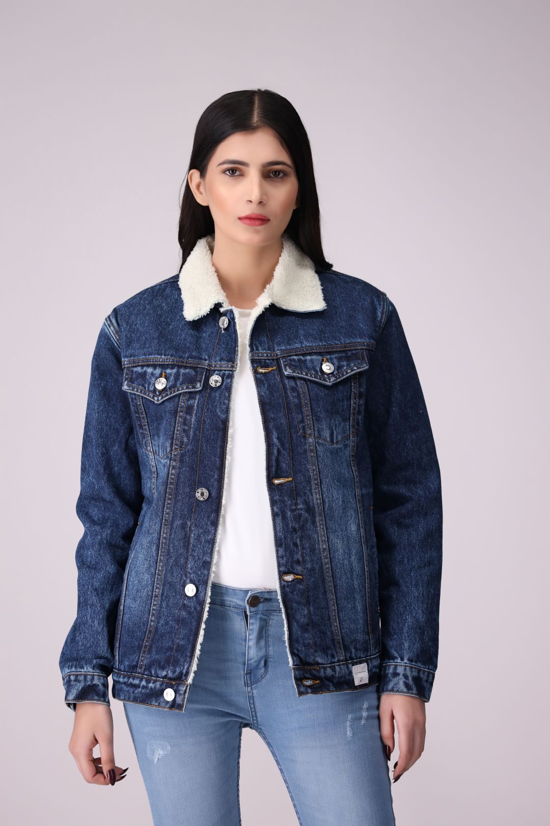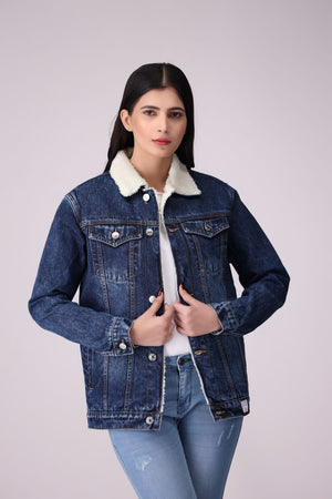 Random Blue Denim Ladies Jacket with full fur inside, regular fit.