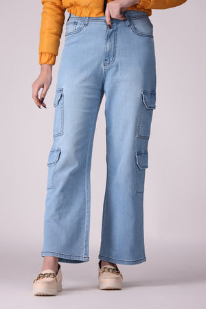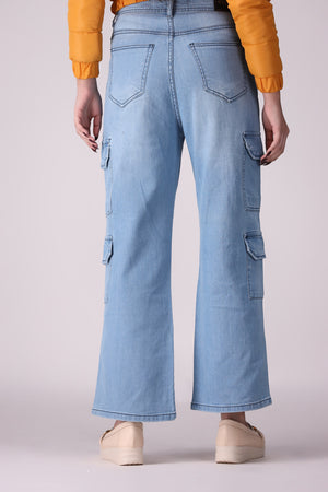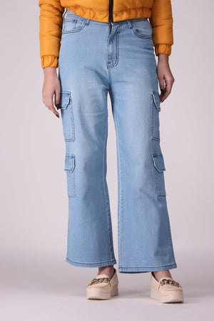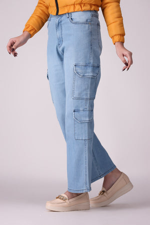 Light Blue 8 Pockets Wide Leg Ladies Jeans, comfort stretch Denim