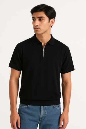 Mens Knitted polo, old money, drop needle cotton fabric, front zip style Black