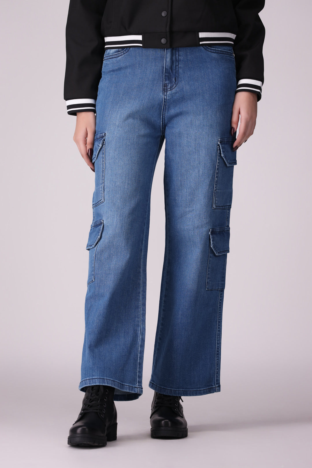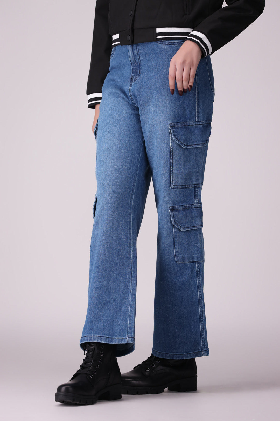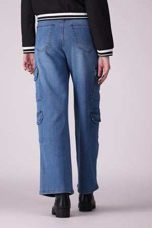Mid Blue 8 Pocket Wide Leg Ladies Jeans, comfort stretch Denim