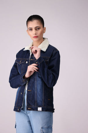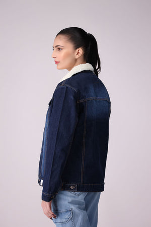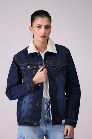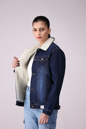 Dark Blue Denim Ladies Jacket with full fur inside, regular fit.